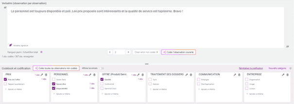 Grâce à cette structuration, le codage devient plus homogène et facilite l’analyse des tendances et des liens entre les différents éléments.