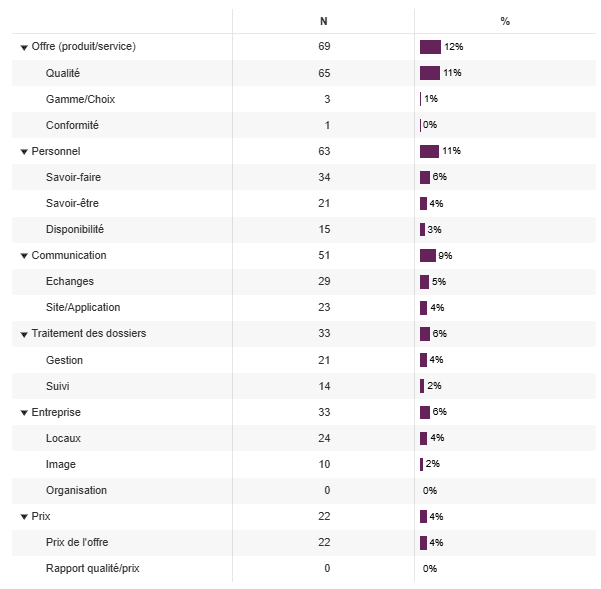 Toujours selon notre étude de satisfaction relative à une prestation de service, les thématiques vont être ainsi précisées à travers des sous-thématiques telles que :